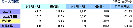 売上高60億15百万円(前年同期比25.1%増)、セグメント利益11億76百万円(同44.7%増)。58店舗の新規出店を行い、上期末の店舗数は1,248店舗(内グループ直営店44店舗)と、前年同期末(1,100店舗)比148店舗、前期末比51店舗、それぞれ増加。会員数は519千人と、前年同期(424千人)比95千人、前期末比15千人、それぞれ増加した。
