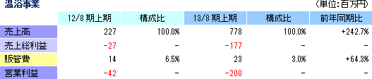売上高7億78百万円(前年同期比242.7%増)、セグメント損失2億円(前年同期は42百万円の損失)。11月に「イオン志摩湯処まねきの湯」(福岡県)をオープンし、上期末の店舗数は7店舗となった。前期から今期上期にかけてオープンした店舗の寄与で売上が増加したものの、光熱水道費(1億71百万円増)、労務費(1億82百万円増)、地代家賃(95百万円増)、仕入高(79百万円増)等を中心にした売上原価の増加を吸収できなかった。ただ、コージェネレーション等、省エネ設備の導入による水道光熱費の削減に目処が付き、黒字化が視野に入ってきた。