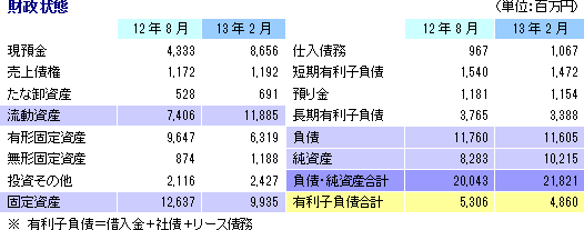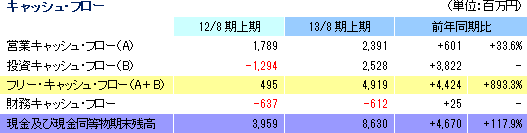 上期末の総資産は前期末比17億77百万円増の218億21百万円。営業CFの増加と有形固定資産の売却で前年同期は4億95百万円だったフリーCFが49億19百万円に増加した事で現預金が大幅に増加。この他、ソフトウエア仮勘定(5億04百万円増)等で無形固定資産が、長期貸付金(4億33百万円増)等で投資その他も増加した。有利子負債を中心に負債が減少する一方、純資産が大幅に増加したため、自己資本比率は45.3%と同5.4ポイント上昇した。