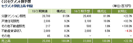 売上高は前期比12.6%増の253億96百万円。引渡しが順調に進み、主力の分譲マンション販売事業の売上が同11.4%増加した他、戸建住宅販売事業も引渡戸数が大幅に増加し同70.7%の増収。一方、不動産賃貸事業は有利子負債の削減と賃貸用不動産のポートフォリオの最適化を目的に資産売却が先行し売上が減少したものの、主力の住居系物件が平均94%以上の高稼働率を維持した事でほぼ想定に沿った着地となった。分譲マンション販売においては契約も順調に進み、翌14/2期竣工物件(引渡物件)の約8割の契約を完了。大型分譲マンション物件の仕入に成功する等、2段階の消費税引き上げを控えて前倒しで取組んでいる仕入も順調に進んだ。 ![]() 分譲マンション販売