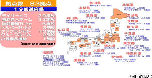 事業は、同社の施設の来場者にサービスを提供するデイサービス事業、有料老人ホーム等の施設の入居者を対象にサービスを提供する施設サービス事業、及び利用者の自宅を訪問して日常生活訓練や機能訓練等を行うリハビリサービスや日常生活の手伝いを行うホームヘルパーサービス等の介護サービスを提供する在宅サービス事業に分かれる。12/3期の売上構成比は、それぞれ35.0%、57.0%、8.0%。2012年10月31日現在の拠点数は次の通り。 ![]() 【沿革】