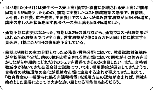 発生ベース売上高は同0.4%増の14億68百万円。現金ベース売上高は、景気回復で民間企業の就職状況が改善していることもあり、国家総合職・外務専門職コースが同微減となったものの、全体として公務員人気が加速している面のほうが強く、国家一般職・地方上級コースが同21.0%増加したのは特筆に値する。全講座中、売上規模第2位に成長している公務員講座が、会計系・法律系の落ち込みをカバーしている格好となった。この他、前年同期に大きく伸びた反動が懸念された社会保険労務士講座も同3.2%増と健闘した。