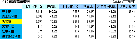 売上高は前年同期比+1.6%の75億円。微生物検査用試薬、一般検査用試薬が堅調だった半面、価格競争の影響で生化学的検査用試薬は減収だった。粗利率は、プロダクトミックスの影響などで同0.4%改善。売上総利益の伸びが販管費の増加(同+2.4%)を吸収し、営業利益は同3.6%の増益となった。前年同期に比べ駐車場収入がなくなり、また、補助金収入も21百万円減少したため、経常利益は小幅増にとどまった。 ![]() 薬剤感受性検査用試薬の「ドライプレート‘栄研’」の売上が伸長し、また、2012年11月に発売した迅速検査試薬「イムノキャッチ-ノロ」の売上が加わった。 全自動尿分析装置用の専用試験紙「ウロペーパーαⅢ‘栄研’」の売上が伸長した。 2013年2月からヘリコバクター・ピロリ感染胃炎の除菌治療の保険適用が拡大されたことにより、血中のヘリコバクター・ピロリ抗体を測定する「Eプレート‘栄研’H.ピロリ抗体Ⅱ」及びヘリコバクター・ピロリ検査と組み合わせて胃の健康状態を調べる(ABC分類)検査に使用する「LZテスト‘栄研’ペプシノゲン」の売上が増加した。 一方、前年同期は供給不足が解消され売上が伸びた便潜血検査用採便容器が、14/3期 1Qは売上が通常の水準に戻ったため、前年同期比で減収だった。 価格競争等により売上が伸びなかった。 ほぼ横ばいだった。 遺伝子検査(LAMP法)の「LoopampマイコプラズマP検出試薬キット」、「Loopamp結核菌群検出試薬キット」の売上及び特許料収入が伸長した。 北米向けの便潜血検査用試薬の売上が代理店の在庫調整の影響および国内同様、採便容器供給の正常化により減少した。 ![]() 以上に加え、利益剰余金が1億円増加したことにより自己資本比率は13年3月末の67.0%から70.0%へ上昇した。 |