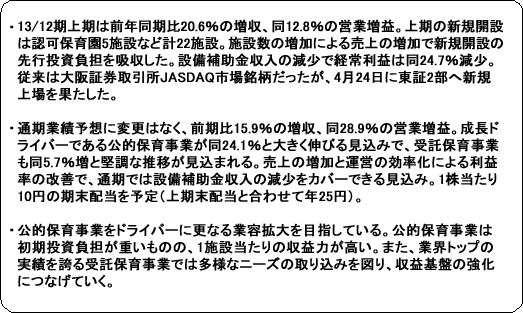 上期の新規開設は22施設(認可保育園5施設、学童クラブ3施設、受託保育14施設)。施設数の増加による売上増で新規開設の準備費用等を吸収し、営業利益が2億58百万円と同12.8%増加。経常利益の減少は、設備補助金収入の減少(2億85百万円→1億45百万円)が主な要因で当初から織り込み済み。従来は大阪証券取引所JASDAQ市場銘柄だったが、4月24日に東証2部へ新規上場を果たした。