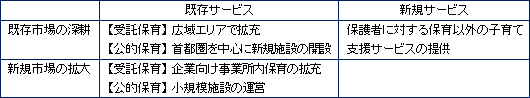 同社のグループ理念である「人から“ありがとう”といわれるサービスを提供する」ために、長期的には保育事業とのシナジーが期待できる新たな事業展開を模索していく。具体的には、受託保育における企業向け事業所内保育の拡充や公的保育における小規模施設の運営といった既存の子育て支援サービスによる新規市場の拡大と、保護者に対する保育以外の子育て支援サービスの提供等、新規サービスの提供を念頭に置いている。