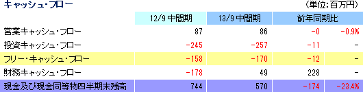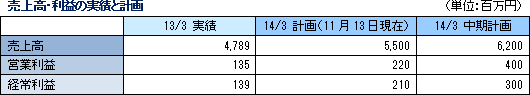 3ヶ年の設備投資として16億円を計画していたが、12.7億円程度になりそう。これは、変化のスピードが速い市場や顧客ニーズに臨機応変に対応し投資回収の実現性を第一に考え、投資を厳選した結果。但し、14/3期は、ASA COLOR LEDの増産ラインの導入や、RFIDタグ用ゴム製品の増産ラインとマイクロ流体チップの量産ラインの導入などにより、設備投資は約6億円まで拡大する見込み。