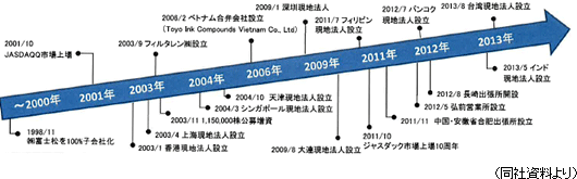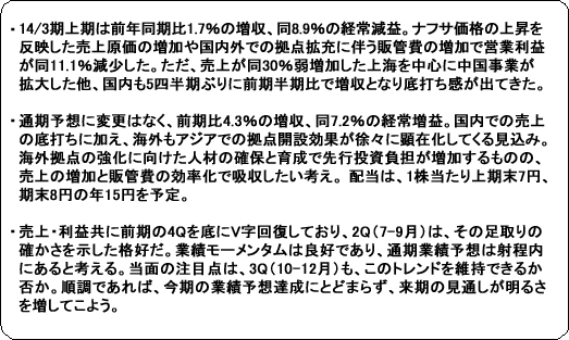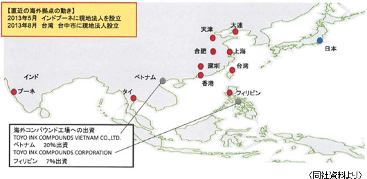 中国沿岸部に加え、広くアジアへ展開する事で変化する顧客ニーズを確実に捉える体制を構築し、更なる成長を目指す考え。この一環として、11年7月にフィリピン、12年7月にタイ(バンコク)、13年は5月にプーネ(インド)、8月には台中(台湾)に現地法人設立した。既に中国沿岸部での拠点開設は一巡しており、14/3期にアジアの拠点整備も完了する。来15/3期よりアジアに展開する各拠点の収益貢献が始まる。