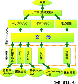 石油精製の過程で得られるナフサ(粗製ガソリン)を高温熱分解して得られるエチレンやプロピレン等の出発原料を重合すると(分子同士を結合させて高分子にする事)、プラスチック、合成繊維原料、合成ゴム等、基礎製品の原料となるポリエチレンやポリプロピレン等の高分子が生まれる。同社はポリエチレンやポリプロピレン等を原料メーカーから仕入れて、OA機器、家電、自動車部品メーカー等に販売している。