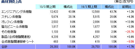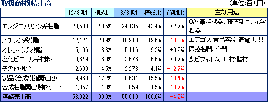 同社が強みを有するエンジニアリング系樹脂市場は、成長著しいアジアにおいて5%以上の成長が続くとみられている。また、国内においても堅調に推移しており、概ね横ばいを維持している。こうした中、販売先の海外展開に対応していく事で海外の成長力を取り込んでいく考え。もっとも、販売先は精密機器、医療機器、家電電子等の勝ち組企業が多く、いずれの販売先も国内外での生産バランスに配慮した経営を行っているため、国内も事業の拡大余地を残している。