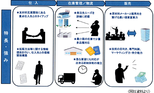 高付加価値商材の拡販の原動力となっているのが、(1)合成樹脂原料に関する高い専門性、(2)商社としてのネットワークを駆使した、メーカーを巻き込んでの提案力、及び(3)顧客との質の高いコミュニケーションが可能とする少量多品種即納体制、の3点。いずれも合成樹脂専門商社に不可欠な要素であり、最もQCDに厳しい日本の優良企業との継続的取引の中で同社が磨き上げてきたコアコンピタンスである。高い専門性を背景にメーカーと一体となって提案営業を進める事でビジネスを広げ、少量多品種の即納対応及び顧客密着型の営業展開で顧客満足度を高めている。