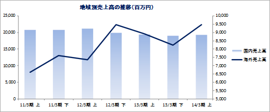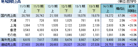 売上高は前年同期比1.7%増の287億53百万円。内訳は、海外売上高が同6.4%増の94億80百万円、国内売上が同0.5%減の192億72百万円。売上が同30%弱増加した上海を中心に中国事業が拡大した他、国内も底打ち感が出てきた(四半期ベースの国内売上高は5四半期ぶりに前期半期比で増収)。