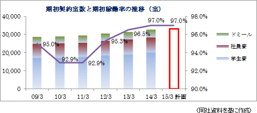 14/3期の期初稼働率は97.0%と前年同期を0.5ポイント上回る水準でのスタート、上期末の稼働契約数は前年同期比1,003名増の30,484名となった。しかし、前年同期に比べ新入寮生の3月早期入寮の増加及び前年同期に大口の留学生法人契約があり、契約金等の売上が期間比較にて減少したため、売上高は前年同期比2.4%増の204億77百万円と微増にとどまった。利益面では稼働室数増加に伴う限界利益増が5億14百万円の増益要因となった。しかし、3月入寮、大口留学生契約の変更により3億6百万円、開業費の負担増により1億50百万円の減益要因となったほか、水道光熱費の増加や修繕費の増加により、営業利益は前年同期比8.3%減の25億64百万円にとどまった。