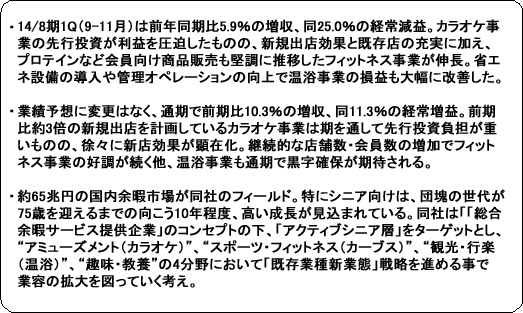 シニア・ファミリー層に特化した業態開発に取り組む事で1店舗当たり入場者増と満足度向上を図っていく。燃料価格の変動等でコスト管理の難しい事業だが、省エネ設備導入と人員の効率化など管理オペレーションの向上で14/8期は黒字転換が見込まれる。黒字体質を定着させ多店舗展開を加速させる事で、早期にカラオケ事業、フィットネス事業に次ぐ第3の柱として事業基盤を確立したい考え。