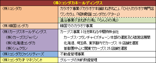 グループは、純粋持株会社である(株)コシダカホールディングスと、カラオケ事業、カーブス事業、温浴事業、及び不動産管理や知的財産管理を手掛ける連結子会社8社。カラオケ事業は(株)コシダカが国内で338店舗を、(株)韓国コシダカが韓国ソウル市内で3店舗を、それぞれ運営。カーブス事業は、中間持株会社(株)カーブスホールディングスの下、連結子会社(株)カーブスジャパンが女性専用フィットネスクラブ「Curves(カーブス)」のFC本部の運営と直営店展開を手掛け、連結子会社(株)北海道コシダカ及び(株)シュクランがフランチャイジーとして直営店を多店舗展開している(店舗数は直営+FC合わせて1,339店舗)。また、11年11月に多店舗展開を本格化した温浴事業は(株)コシダカが新規事業として育成中の事業であり、7店舗を展開している(店舗数は、いずれも13年8月末)。