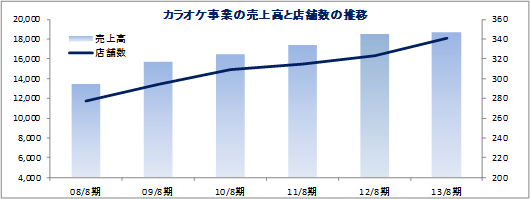 約65兆円の国内余暇市場は同社にとって無限とも言える広さだ。足元で余暇活動の主役が60代以上に変化している事からもわかるように、特にシニア市場は、団塊の世代(1947年~49年までの間に出生した世代)が75歳を迎えるまでの向こう10年程度、高い成長が見込まれている。こうした中、同社は「「総合余暇サービス提供企業」のコンセプトの下、「アクティブシニア層」をターゲットとし、“アミューズメント(カラオケ)”、“スポーツ・フィットネス(カーブス)”、“観光・行楽(温浴)”、“趣味・教養”の4分野において、既存事業間のシナジーを追求すると共に「既存業種新業態」戦略を進める事で業容の拡大を図っていく考え。数値面では、中長期の目標としてグループ売上高1,000億円としている。 カラオケ事業 国内でのアクティブシニア層の開拓と海外展開