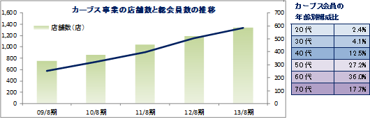 事業は、「カラオケ本舗まねきねこ」(郊外中心)やひとりカラオケ専門店「ワンカラ」(都心や地方都市の繁華街で展開)を運営するカラオケ事業、“女性専用30分健康体操教室”として中高年齢層をターゲットに女性専用フィットネスクラブ「Curves(カーブス)」を展開するカーブス事業、新規事業として育成中の温浴事業(各種の温浴設備を備えた施設の運営。「居抜き出店方式」のノウハウを活用し店舗展開)、及び不動産管理事業等のその他に分かれる。13/8期の売上構成比は、カラオケ事業55%、カーブス事業40%、温浴事業5%、その他1%。