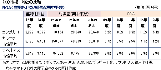 「レジャー白書2013」(公益財団法人日本生産性本部)によると、2012年の余暇市場はほぼ横ばい(前年比0.3%減)の64兆7,272億円。このうち、娯楽部門は前年比0.7%増で、テレビゲーム・ゲームソフト、ゲームセンターが減少したものの、東日本大震災(以下、震災)後の落ち込みの反動でパチンコ・パチスロと公営競技が伸びた他、カラオケボックス(ルーム)も若干増加した。カラオケボックス(ルーム)は震災後の「安近短志向」の高まりで11年から12年にかけて市場が拡大したが、12年後半は「安近短志向」の一巡で市場拡大にブレーキがかかったようだ。また、「レジャー白書2013」は余暇活動の主役となる年代層についても言及しており、過去10年間で主役が10代から60代以上に変化した、としている。ちなみに、高齢者が余暇活動を開始・再開した理由としては、「年齢や健康、体力にあっているから」、「費用が負担できるから」等が多いと言う。 (2)成長戦略 「総合余暇サービス提供企業」を標榜し、“既存業種新業態」戦略”を推進