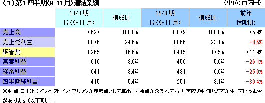売上高18億94百万円(前期比23.1%増)、セグメント利益94百万円(前期は3億17百万円の損失)。14/8期に黒字化を達成し、15/8期以降は攻めの経営に転じ、多店舗を進めたい考え。