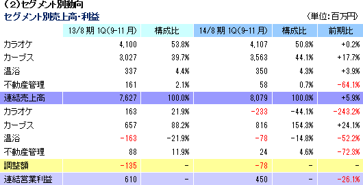 売上高3億50百万円(前年同期比3.9%増)、セグメント損失78百万円(前年同期は1億63百万円の損失)。新規出店はなかったが売上高が順調に増加。省エネ設備導入と人員の効率化など管理オペレーションの向上で損失が大幅に減少した。当期は新規出店の計画がないが、カラオケ健康歌体操教室やロウリュ(熱気浴・蒸気浴)といった新たなコンテンツの開発に加え、新規のファン獲得をも視野に入れた各店独自イベントの積極展開等で既存店の売上増に取り組んでいる。当期は通期での黒字化(94百万円のセグメント利益)を計画しており、これを踏まえて15/8期以降は攻めの経営に転じ、多店舗展開を進めたい考え。 |