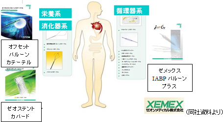 メディカルデバイス市場は、景気の影響が少なく、また日本における高齢化の進行と新興国の市場拡大で成長が見込まれる一方、医療機器の製造・販売会社に対する法的要件が厳格であるほか、薬事承認申請作業が必要で、医療従事者との関係作りが不可欠であること等から参入障壁が高く、魅力的な市場であると同社では考えている。同社は、1974年に人工腎臓の開発を開始したのを皮切りにメディカルデバイス事業を積極的に推進し、1989年に子会社ゼオンメディカル株式会社を設立し、同社グループ内で開発・製造・販売・薬事のすべての分野における対応が可能な体制を構築している。 消化器系製品では、胆道結石除去用の差別化製品である「オフセットバルーンカテーテル」、国産初の胆管カバードステント「ゼオステントカバード」、また循環器系製品では、心筋梗塞時等に心臓の拍動を補助するデバイスとして、世界最細径の「ゼメックス IABPバルーンプラス」など、豊富な開発実績を有している。 ![]() 同社の開発製品であるゼメックスクラッシャーカテーテル、ゼメックスバスケットカテーテルNT、ゼメックスバルーンカテーテルなど、巨大結石から胆泥・胆砂まであらゆる胆道結石を除去できるデバイスをラインアップしており、結石除去デバイス全体で50%のシェア獲得を目指す。 ④化学品事業