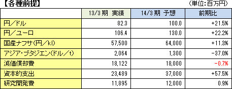 売上高は前年同期比369億円増収の2,235億円。光学フィルム中心に数量増要因が+342億円、約20%の円安による為替要因+111億円があった一方、エラストマー素材の海外市況が軟調で価格要因は -84億円となった。営業利益は同73億円増の244億円だった。売上と同要因により数量要因+48億円、価格要因-84億円、為替要因+111億円に加え、原料・原価要因-12億円、本社経費など-12億円、コストダウン+22億円などで、4割の増益となった。 円安等により営業外損益が改善したことに加え、株高により投資有価証券評価損も縮小し、経常利益は約6割増、四半期純利益は約5割増となった。 ![]() ![]() 高機能樹脂では、光学フィルムが+90%と大きく伸びた。TV向けは2.9倍、スマートフォンやタブレット等中小型向けも+16%と好調だった。TV向けでは2013年型モデル向けが大きく寄与した。光学樹脂も+14%と堅調。営業費用も2ケタ増加したが、数量要因が大きく寄与し大幅な増益となった。 ![]() ![]() 総資産が35億円増加した一方、有利子負債を114億円削減したこと等により負債は144億円減少し、自己資本は204億円増加。自己資本比率は46.4%と2013年3月末の45.2%から1.2ポイント上昇した。D/Eレシオも0.42から0.31へと低下した。 (4)トピックス