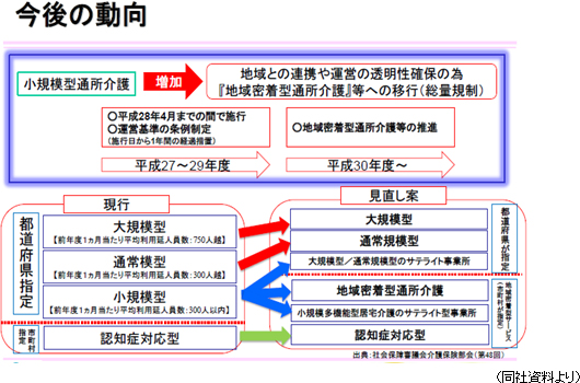 通所介護サービスには機能訓練型、レスパイト型、認知症型、お泊り型等多様なサービスがある。こういった中、小規模事業所については、介護報酬単価が高く設定されており、参入事業所数の増加が顕著な状況。通所介護事業所が06年4月の19,075事業所から13年3月には35,453事業所へ83%増加したが、そのうち小規模型事業所については7,075事業所から17,963事業所へ153%増加した。小規模型通所介護の増加にあわせ、今後は地域との連携や運営の透明性確保の為「地域密着型通所介護」等へ移行される見通し(総量規制)。また、要支援者の訪問介護、通所介護の総合事業(介護予防・生活支援サービス事業)への移行が見込まれる。 これらの法や制度改正は同社の業績に大きな影響を与えることはなさそうだが、引き続き市町村等と情報を共有していく。 ![]() 【損保ジャパンとの資本・業務提携】