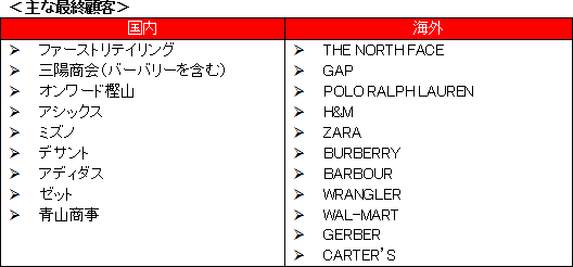 「2013年11月期 売上高 17,281百万円。売上構成比 52.1%」 ![]() ファーストリテイリング、GAPなどとは直接取引を行っている。 海外における同社の知名度は高く、GAP、H&M、ZARAといったメーカーとは10年から20年以上という長い取引関係にある。 ![]() ◎生活産業資材関連事業