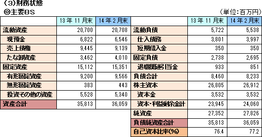 前年同期比48.3%増収、黒字転換。<服飾資材関連> 衣料用服飾資材が増加。昨年低調だった高級服飾資材も回復傾向にある。 <生活産業資材関連> 自動車内装品の取り扱い車種が増加したほか、フロアマット用のエンブレムも増加した。 ![]() この結果、自己資本比率は前期末に比べ0.8%上昇の77.2%となった。 |