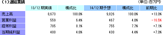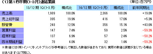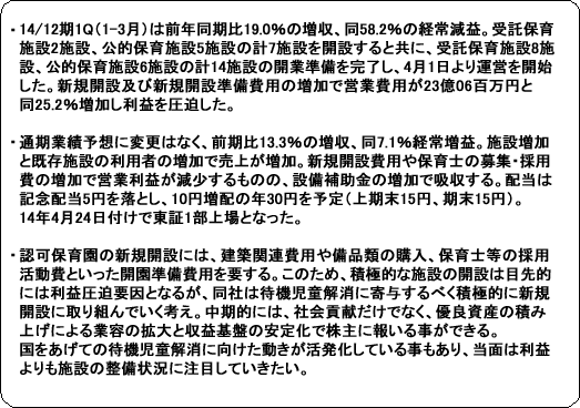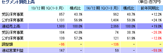 売上高は前年同期比19.0%増の23億66百万円。内訳は、受託保育事業が同12.2%増の9億62百万円、公的保育事業が同24.1%増の14億04百万円。受託保育施設2施設、公的保育施設5施設の計7施設を開設すると共に(前年同期は受託保育施設2施設のみ)、受託保育施設8施設、公的保育施設6施設の計14施設の開業準備を完了した(同、受託保育施設12施設、公的保育施設8施設の計20施設)。この結果、第1四半期期末施設数は241施設となり、開設準備を終えた14施設も4月1日には運営を開始した。業利益は同59.3%減の59百万円。新規開設及び新規開設準備費用の増加で営業費用が23億06百万円と同25.2%増加し利益を圧迫した。セグメント別では、受託保育事業が同28.3%減の74百万円、公的保育事業が同12.8%減の1億21百万円。 ![]() *前期まで「受託保育事業」として運営していた小規模保育施設については経営管理方針を一部見直したことにより2014年12月期第1四半期より、「公的保育事業」に報告セグメントを変更。
