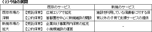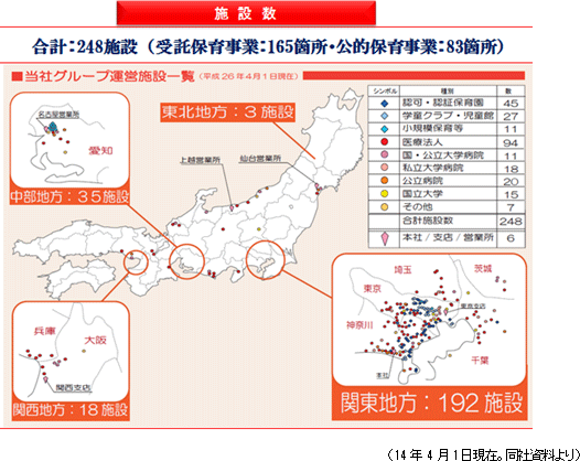 病院、大学、企業等に勤務している保護者向けの保育施設の運営受託事業。顧客の規模や勤務時間に合わせた保育サービスを提供する事で働きやすい職場環境の構築をサポートしている(勤務時間が不規則な職場でも、子育て中の方が働きやすい環境となり、“優秀な人材確保”に役立っている)。「設置主体従業員」の“福利厚生施設”として設置され、同社は運営料支払いを受けており、施設が一定の条件を満たしていれば、設置主体には助成金が支給される。主な取引先は、東京大学医学部附属病院、千葉大学医学部附属病院、筑波大学、大阪大学、神戸大学、武田薬品工業(株)等。