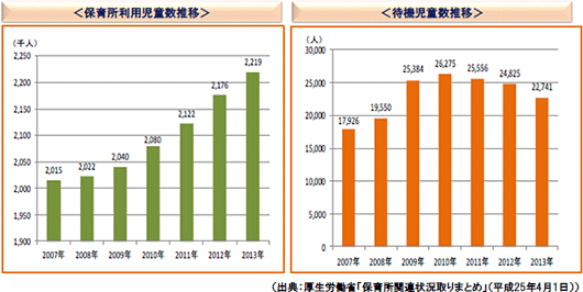 「男女共同参画白書 平成25年版」によると、平成に入り「共働き世帯数」が「男性雇用者と無業の妻からなる世帯数」を逆転し、現在は共働き世帯が大幅に増えている。一方、「厚生労働省平成24年国民生活基礎調査の概況」によると、子供のいる世帯の年収は平成8年をピークに低下傾向にある。この結果、子供がいる共働き世帯が増加し、保育所利用児童数も増加傾向にあるが、保育所の整備が追い付いておらず、保育所に入れない待機児童の増加が社会問題化している事は周知の通り。待機児童数は、2011年の26,275人をピークに漸減傾向にはあるものの、13年末で22,741人と待機児童問題の解消には程遠い状態。地域別では、地方での待機児童解消は緩やかに進む一方、東京都が増加傾向にある(厚生労働省「保育所関連状況取りまとめ」:平成25年4月1日)。