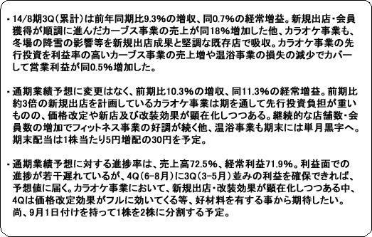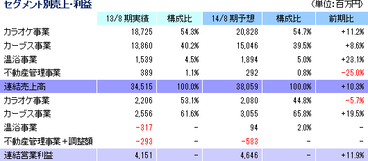 事業は、「カラオケ本舗まねきねこ」(郊外中心)やひとりカラオケ専門店「ワンカラ」(都心や地方都市の繁華街で展開)を運営するカラオケ事業、“女性専用30分健康体操教室”として中高年齢層をターゲットに女性専用フィットネスクラブ「Curves(カーブス)」を展開するカーブス事業、新規事業として育成中の温浴事業(各種温浴設備を備えた施設の運営。「居抜き出店方式」のノウハウを活用し店舗展開)、及び不動産管理事業等のその他に分かれる。13/8期の売上構成比は、カラオケ事業54%、カーブス事業40%、温浴事業5%、その他1%。