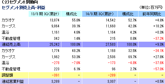 売上高は前年同期比9.3%増の275億83百万円。新規出店・会員獲得共が順調に進んだカーブス事業の売上が同18%増加した他、カラオケ事業も、冬場の降雪の影響等を新規出店成果と第2四半期以降の既存店回復で吸収して売上が増加した。利益面では、国内での新規出店及び改装の増加等、カラオケ事業の先行投資を利益率の高いカーブス事業の売上増や温浴事業の損失の減少で吸収。営業利益が33億07百万円と同0.5%増加した。四半期純利益が大幅に減少したのは、前年同期は固定資産売却益15億39百万円を特別利益に計上したため。 ![]() カラオケ事業