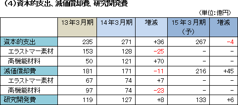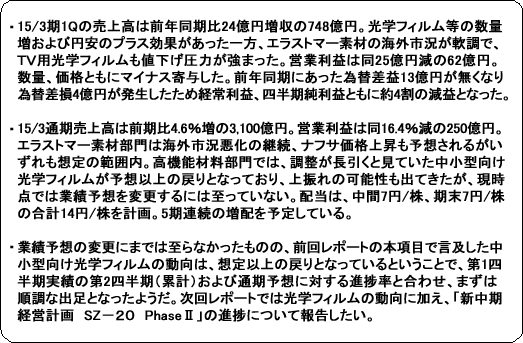 売上高は前年同期比24億円増収の748億円。光学フィルム等の数量増要因が+36億円、円安による為替要因+10億円があった一方、エラストマー素材の海外市況が軟調だったことに加え、TV用光学フィルムの値下げ圧力により価格要因は-22億円となった。営業利益は同25億円減の62億円。数量要因-2億円、価格要因-22億円、為替要因+10億円。原料のナフサ価格上昇による原価要因-4億円に加え、技術開発費が6億円増加し本社経費等は-7億円だった。 前年同期にあった為替差益13億円が無くなり為替差損4億円が発生したため経常利益、四半期純利益ともに約4割の減益となった。 ![]() ゴム、ラテックス共に海外市況軟調、競争激化により採算を重視し、ボリュームを減少させた。 ゴムの販売数量は、汎用ゴムが国内、輸出とも減少し10%のマイナスだったのに対し、特殊ゴムは国内、輸出、海外子会社ともに堅調で、5%のプラスだった。 特殊ゴムの構成比は数量ベースで36%(前年同期32%)、金額ベースで58%(同53%)といずれも上昇している。 ![]() 高機能ケミカル部門の売上高増減率の内訳は、化学品が前年同期比20%増、電子材料が同8%増、電池材料が同2%増だった一方、トナーが同13%の減少した。 高機能樹脂部門では、光学フィルムが同12%増、COP樹脂が同13%増だった。 光学フィルムの販売数量は同18%の増加。前期第2四半期にピークをつけ第4四半期に調整に入っていたスマホ、タブレット用の中小型向フィルムはこの4-6月に戻り基調となっている。 ![]() 子会社の商事部門 東京材料株式会社の取扱高が増加した。 ![]() 売上高は数量要因27億円増に対し、価格要因、為替要因がそれぞれマイナス6億円、マイナス2億円であった。 営業利益については、数量要因および本社経費等がそれぞれ7億円のプラス、10億円のプラスであったのに対し、価格要因マイナス6億円、為替要因マイナス2億円、原価要因マイナス1億円であった。 エラストマー素材部門では、海外市況が未だ好転していない。高機能材料部門では、光学フィルムのうちTV向けは高水準が続いている一方、高採算の中小型向けは前期第4四半期に調整に入った後、緩やかながらも戻している。 ![]() ![]() ![]() 総資産が51億円増加した一方、法人税及び賞与支払いに対応して短期借入を増加させたため、負債合計は45億円増加した。この結果自己資本比率は47.4%と2014年3月末の47.9%から若干低下した。 |