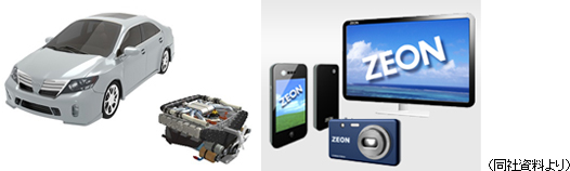GPI法によってC5留分から抽出、合成されたシクロオレフィンポリマーは、独自技術で開発した熱可塑性プラスチックで、製品としてZEONEX® とZEONOR®がある。ZEZEONEX®は優れた光学特性を活かして、携帯電話に搭載されているカメラの小型レンズのほかプリンター、光ピックアップ、ミラーといった光学部品に使用されている。 ZEONOR®は高透明性や転写性、耐熱性等を活かし、透明汎用エンプラとして、導光板や自動車部品、容器、ディスクなどの幅広い分野で使用されている。 シクロオレフィンポリマーから、世界初の溶融押出製法で開発された光学フィルムがゼオノアフィルム®で、液晶テレビやスマートフォン、タブレット端末のディスプレイに使用されているほか、今後はデジタルサイネージなど幅広い用途での利用が期待されている。 ![]() 従来の3Dテレビは画面に対し両目が水平な状態であれば立体画像が認識できるが、水平でないと画面が暗く見えたり立体画像が不鮮明であった。これに対し、このフィルムは3DTVの視野角を大きく広げることにより、斜めから見た場合でも鮮明に立体画像が認識できる。 有機ELの光反射防止フィルムとしての採用も進んでおり、今後も中小型用フラットパネルディスプレイ向けの需要拡大が見込まれることから、高岡および氷見の2工場(合計 年間生産 1,500万㎡)に加えて、福井県敦賀市に新工場が2013年10月に完成した。 他にも、携帯電話、スマートフォン、液晶テレビ用途に代表される、電子デバイス向け塗布型有機絶縁材料ZEOCOAT®がある。 ZEOCOAT®は、透明性が高く、吸水性が非常に低いほか、膜からガス成分を発生しにくいためディスプレイの画質と信頼性の向上を同時に達成することができる。 今後、液晶に比べ薄く成型できる有機ELディスプレイ向けに拡販を積極的に進めるとともに、新しい半導体を用いた薄膜トランジスタやフレキシブルディスプレイ用の絶縁材料での採用を目指している。 ②エナジー用部材