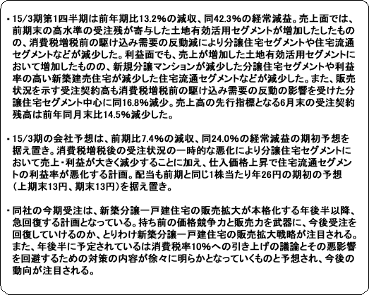 売上高は前年同期比13.2%減の169億52百万円。前期末の高水準の受注残が寄与した土地有効活用セグメントが増加したものの、消費税増税前の駆け込み需要の反動減により新規分譲マンションの引渡しが減少した分譲住宅セグメントや分譲建売住宅の引渡戸数が減少した住宅流通セグメントなどが減少した。また、販売状況を示す受注契約高は、中古住宅の受注が増加した住宅流通セグメントで増加したものの、分譲マンションの受注減少が影響した分譲住宅セグメントや消費税増税の影響を受けた賃貸住宅等建築請負の受注が減少した土地有効活用セグメントなどで減少し、同16.8%減少した。また、6月末の受注契約残高も、自由設計住宅などの減少により前年同月末比14.5%減少した。経常利益は、前年同期比42.3%減の7億6百万円。売上が増加した土地有効活用セグメントにおいて増加したものの、新築分譲マンションが減少した分譲住宅セグメントや利益率の高い新築建売住宅が減少した住宅流通セグメントなどにおいて減少した。売上総利益率は同0.2ポイント低下。売上が減少する中、販管費が前年同期比微増となったことから、営業利益は同42.0%減の7億19百万円となった。 ![]() 住宅流通セグメント売上高は前年同期比12.5%減の55億円、セグメント利益は同64.3%減の67百万円。売上及び利益の減少は、利益率の高い新築建売住宅の販売が減少したことが影響。中古住宅の仕入れが回復傾向となる中、中古住宅の受注契約戸数が325戸(前年同期は311戸)と増加し、住宅流通セグメントの受注契約高は63億30百万円と同4.5%増加。受注契約残高も中古住宅の増加が寄与し、32億72百万円と同9.2%増加した。 土地有効活用セグメントの売上高は前年同期比103.5%増の34億65百万円、セグメント利益も同101.3%増の4億54百万円。売上及び利益の増加は、前期末の高水準の受注残の案件引渡しが順調に進んだもの。一方、消費税増税後の影響を受けた賃貸住宅等建築請負が減少し、受注契約高は28億63百万円と同25.4%減。受注契約残高は個人投資家向け一棟売賃貸アパートが増加し103億92百万円と同22.4%増加した。 上記の他、賃貸及び管理事業セグメントは、土地有効活用事業にリンクした賃貸物件及び管理物件の取扱い件数が増加したことや中古住宅アセット事業による中古賃貸物件の増加により売上高が25億60百万と前年同期比10.2%増加し、セグメント利益も2億1百万円と同83.2%増加した。また、立ち上げ期にある注文住宅事業は、売上高が1億26百万円と同30.0%減少したものの、前期に実施した集客効果が望めない住宅展示場の閉鎖整理による収益性の改善からセグメント利益は10百万円と同104.6%増加した。 ![]() ![]() ![]() |