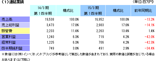 ![]() 前年同期比13.2%の減収、同42.3%の経常減益