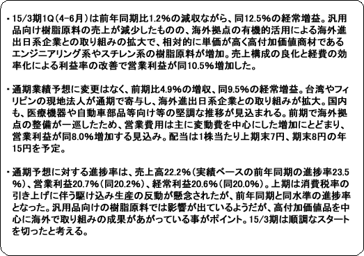 高付加価値商材の拡販の原動力となっているのが、(1)合成樹脂原料に関する高い専門性、(2)商社としてのネットワークを駆使した提案力、及び(3)顧客との質の高いコミュニケーションに基づく少量多品種即納体制、の3点。いずれも合成樹脂専門商社に不可欠な要素であり、最もQCD(Quality、Cost、Delivery:品質、価格、納期)に厳しい日本の優良企業との継続的取引の中で同社が磨き上げてきたコアコンピタンスである。高い専門性を背景にメーカーと一体となって提案営業を進める事でビジネスを広げ、少量多品種の即納対応と顧客密着型の営業展開で顧客満足度を高めている。