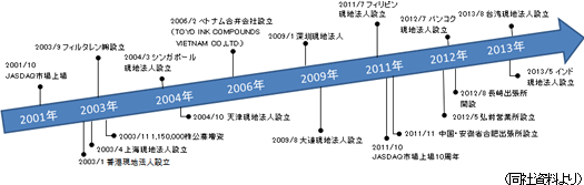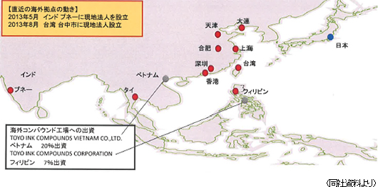 中国沿岸部に加え、広くアジアへ展開する事で変化する顧客ニーズを確実に捉える体制を構築し事業拡大の糧とする。この一環として、11年7月にフィリピン(マニラ)、12年7月にタイ(バンコク)、13年は5月にインド(プネー)、8月には台湾(台中)に現地法人を設立した。14/3期でアジアの拠点整備がほぼ完了し、15/3期以降、アジアに展開する各拠点の業績貢献が徐々に始まる。