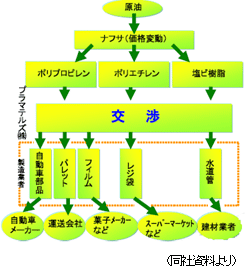 石油精製の過程で得られるナフサ(粗製ガソリン)を高温熱分解して得られるエチレンやプロピレン等の出発原料を重合すると(分子同士を結合させて高分子にする事)、プラスチック、合成繊維原料、合成ゴム等、基礎製品の原料(樹脂原料)となるポリエチレンやポリプロピレン等の高分子が生まれる。同社はポリエチレンやポリプロピレン等の樹脂原料(ベース樹脂)やコンパウンド(樹脂原料に目的とする性能や機能を得るために強化材や添加剤を配合したもの)を原料メーカーからペレット(加工しやすいように3~5mm程度の粒子状にしたもの)として仕入れて、OA機器、家電、自動車部品メーカー等に販売している。