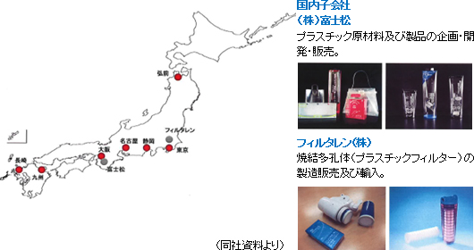 ![]() グループでの拡大戦略や積極的な海外展開も同社の特徴で、03年1月に香港に現地法人を、同年4月に上海に現地法人を、それぞれ設立。その後、シンガポールに拠点を開設し(04年3月に法人化)、04年10月に天津に現地法人、06年2月には東洋インキ製造(株)との合弁でベトナムにコンパウンド製造・販売会社を設立(出資比率20%)。アジア進出を進める日系企業への供給体制の充実を図るべく、09年1月にシンセン、同年8月に大連、11年7月にフィリピン、12年7月にタイ(バンコク)、13年5月にインド(プネー)、同年8月に台湾、と子会社を相次いで設立した。 また、グループに製造部門を有し、上記の合弁会社の他、98年11月に二次加工等の(株)富士松を100%子会社化し、更に03年9月にはフィルタレン(株)を設立して同年10月よりメディカル向け等の合成樹脂フィルターの製造・販売を開始した。 【事業の特徴】