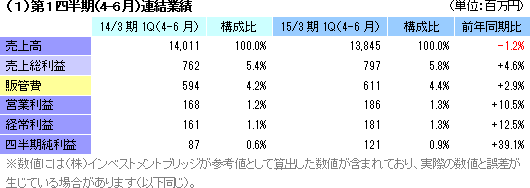![]() 前年同期比1.2%の減収ながら、同12.5%の経常増益