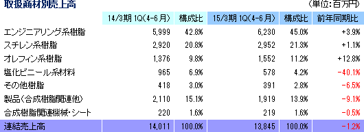 販売先業界別の構成比(個別ベース売上高上位100社)は、日本メーカーが圧倒的な強みを持つ事務機器・OA向けが32.6%、スチレン系・オレフィン系が中心の家電・電子向けが15.0%、塩化ビニール系材料が中心の建材11.0%、オレフィン系のポリエチレン・ポリスチレン等の医療機器が10.4%。この他、自動車向け6.4%、容器・化粧品4.3%、玩具・その他20.4%、と取引先は多様だ。 【コアコンピタンスと競合先】