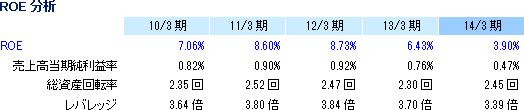 *上記は決算短信及び有価証券報告書のデータを基に算出しているが、算出に際して必要となる総資産及び自己資本は期中平残(前期末残高と当期末残高の平均)を用いている(決算短信及び有価証券報告書に記載されている自己資本比率は期末残高で算出されているため、その逆数と上記のレバレッジは必ずしも一致しない)。 尚、東証発表の「決算短信集計」によると、東証1部、東証2部、及びマザーズ上場企業の14/3期のROEは、金融を除く全産業8.65%(前期は4.99%)、製造業8.55%(同4.53%)、非製造業8.79%(同5.67%)。 |