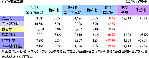 ![]() 前年同期比8.7%の減収、同38.6%の経常減益