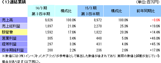 ![]() 前期比1.3%の増収、同14.9%の経常増益