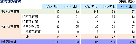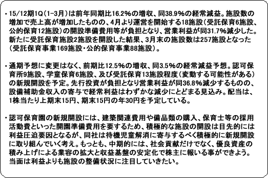 法的にも追い風が吹いてきた受託保育において企業向け事業所内保育の拡充を図り、公的保育においては、株式会社の公的保育施設の運営実績がない自治体で小規模保育施設の運営実績の積み上げを図る。また、新規サービスでは、保育の実践ノウハウ紹介サイト「保育の引き出し」を開設した他、保育事業でのノウハウを活かした行政機関等から要望の多い研修事業等の準備を進めている。