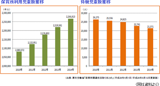 「男女共同参画白書 平成25年版」によると、平成に入り「共働き世帯数」が「男性雇用者と無業の妻からなる世帯数」を逆転し、現在は共働き世帯が大幅に増えている。一方、「厚生労働省平成24年国民生活基礎調査の概況」によると、子供のいる世帯の年収は平成8年をピークに低下傾向にある。この結果、子供がいる共働き世帯が増加し、保育所利用児童数も増加傾向にあるが、保育所の整備が追い付いておらず、保育所に入れない待機児童の増加が社会問題化している事は周知の通り。待機児童数は、2010年の26,275人をピークに漸減傾向にはあるものの、14年末で21,371人と待機児童問題の解消には程遠い状態。地域別では、地方での待機児童解消は緩やかに進む一方、東京都が増加傾向にある(厚生労働省「保育所関連状況取りまとめ」:平成26年4月1日)。