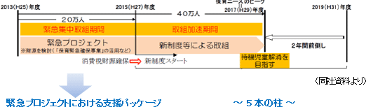 2013年6月、2013年度から2017(平成29)年度にかけての5年で40万人分の保育の受け皿を確保し、従来の計画よりも2年前倒しで待機児童の解消を目指す「待機児童解消加速化プラン」が内閣府から公表された。