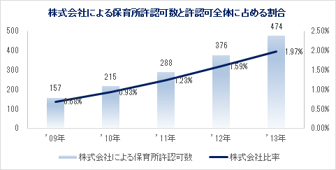 株式会社が運営する認可保育所のシェアは上昇傾向にあるが、株式会社の比率は2013年で未だ1.97%程度に過ぎない。競合他社をみると、2012年度の業界1位がJPホールディングス(売上高157億47百万円)、2位こどもの森(同92億50百万円)、3位同社(同86億73百万円)、4位ピジョン(72億40百万円)。2011年に同社は順位を一つ上げたが、過去数年間、保育業界上位の顔ぶれは変わらない。